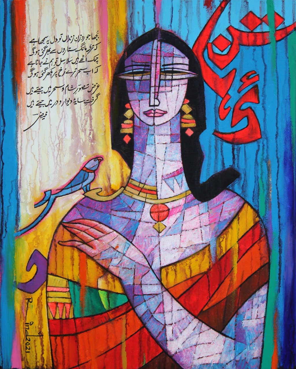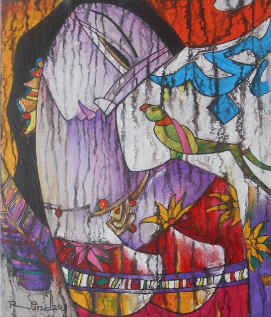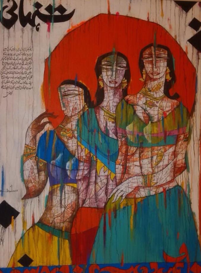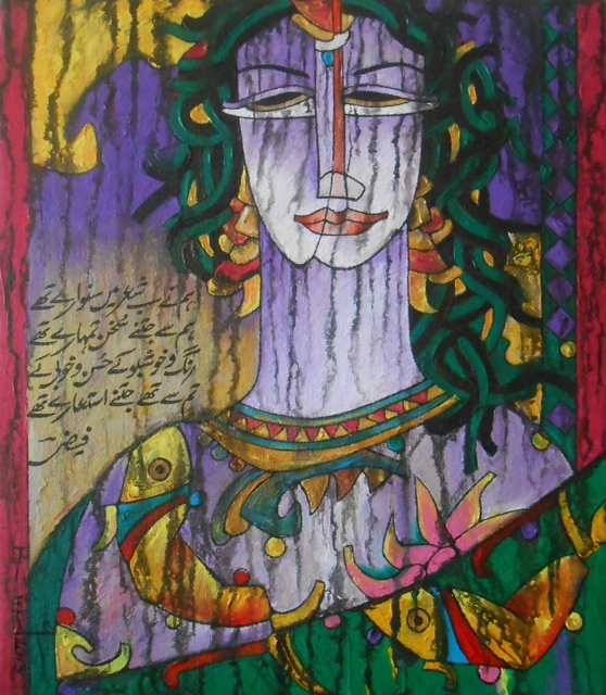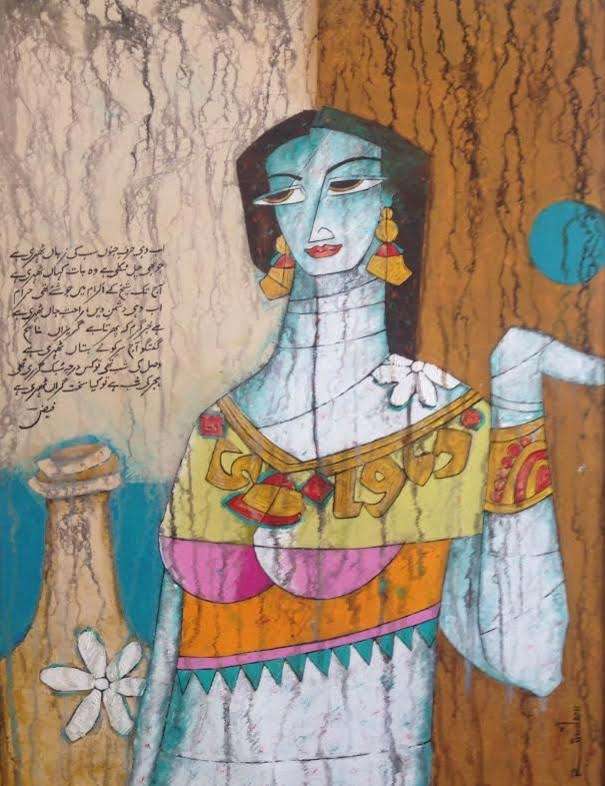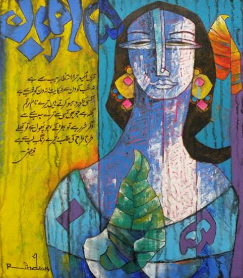 A S Rind an artist born in 1960 in Rahim Yar Khan, He is one of the most demanding artist from Pakistani art. His exceptional style of blending poetry of Mirza Ghalib, Faiz Ahmed Faiz and more with figures is startling. His modern approach towards art with carrying the tradition of literature is one of its own kind. He has numerous Solo and Group exhibitions nationally and internationally in his credits and awarded with several valuable awards.