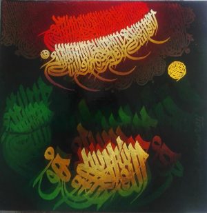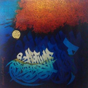 Ahmed Khan, born in 1938, is thought of as Pakistan’s greatest living calligraphic artist. He has enormously varied talents in the genres of sculpture and designing as well, but his calligraphic work has attained a legendary stature.