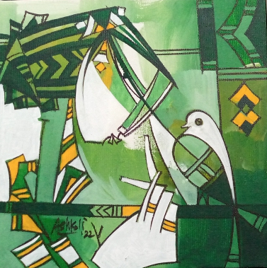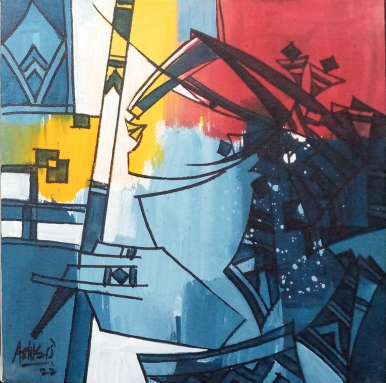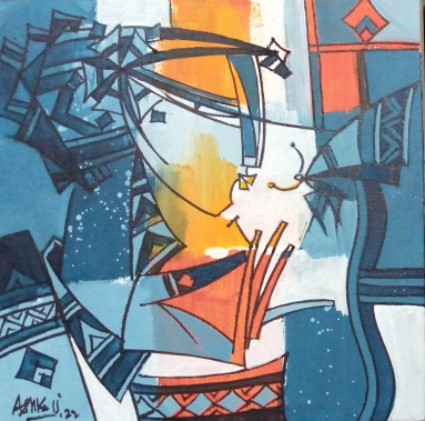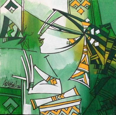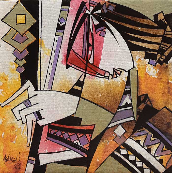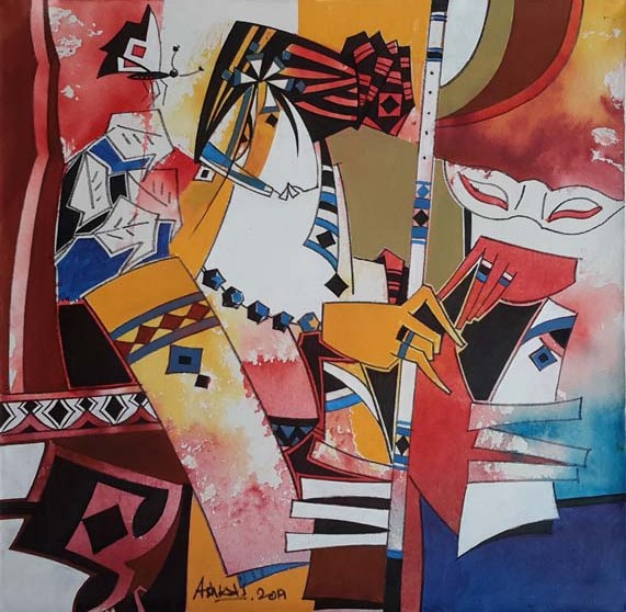 Ashkal work is strongly influenced by cubism. His series explores themes surrounding the senses. Sight, sound and smell are well explored, as evidenced by the appearance of musical instruments, flowers, birds and butterflies. The hypnotic effects of music are of particular interest to him, an effect magnified by the siren-like quality of his women. The decorative elements in his work are also fascinating because, while they are thoroughly modern in their angular, cubist rendering, they are also simultaneously reminiscent of ancient Egypt or Mesoamerican motifs. His color palette of mainly red, white, blue, yellow and black is likewise very modern yet each of these colors was also important in ancient Egyptian art and culture as symbolizing a certain meaning or emotion. Ashkal thus demonstrates that he is not only well-traveled, which indeed he is, but also that he has a fascination for diverse cultures and a healthy curiosity about them.