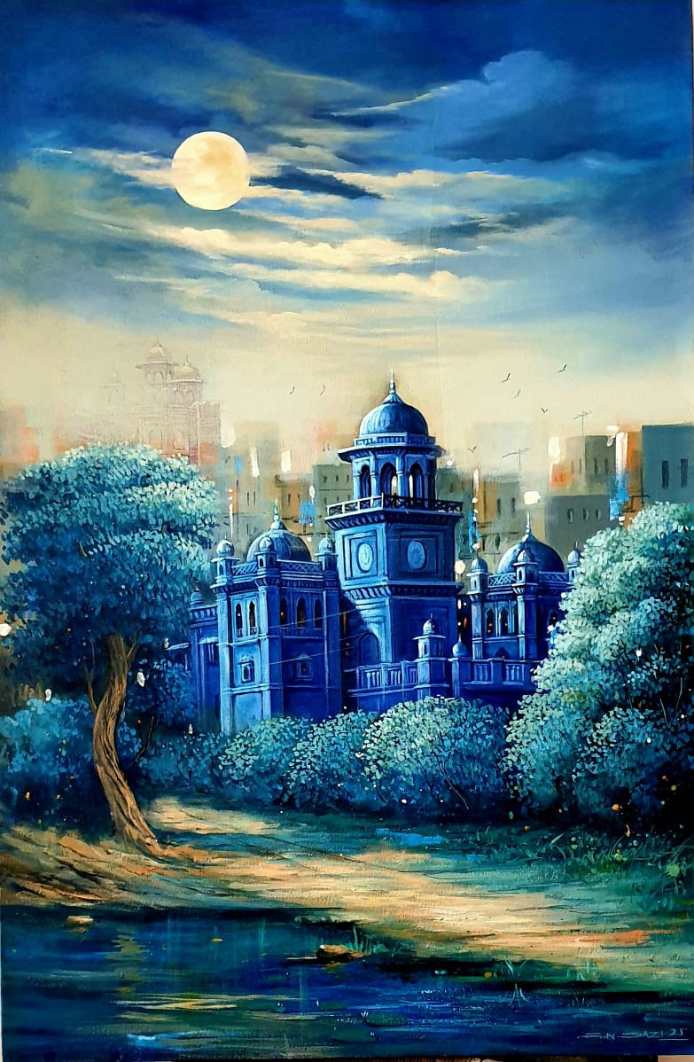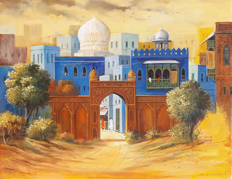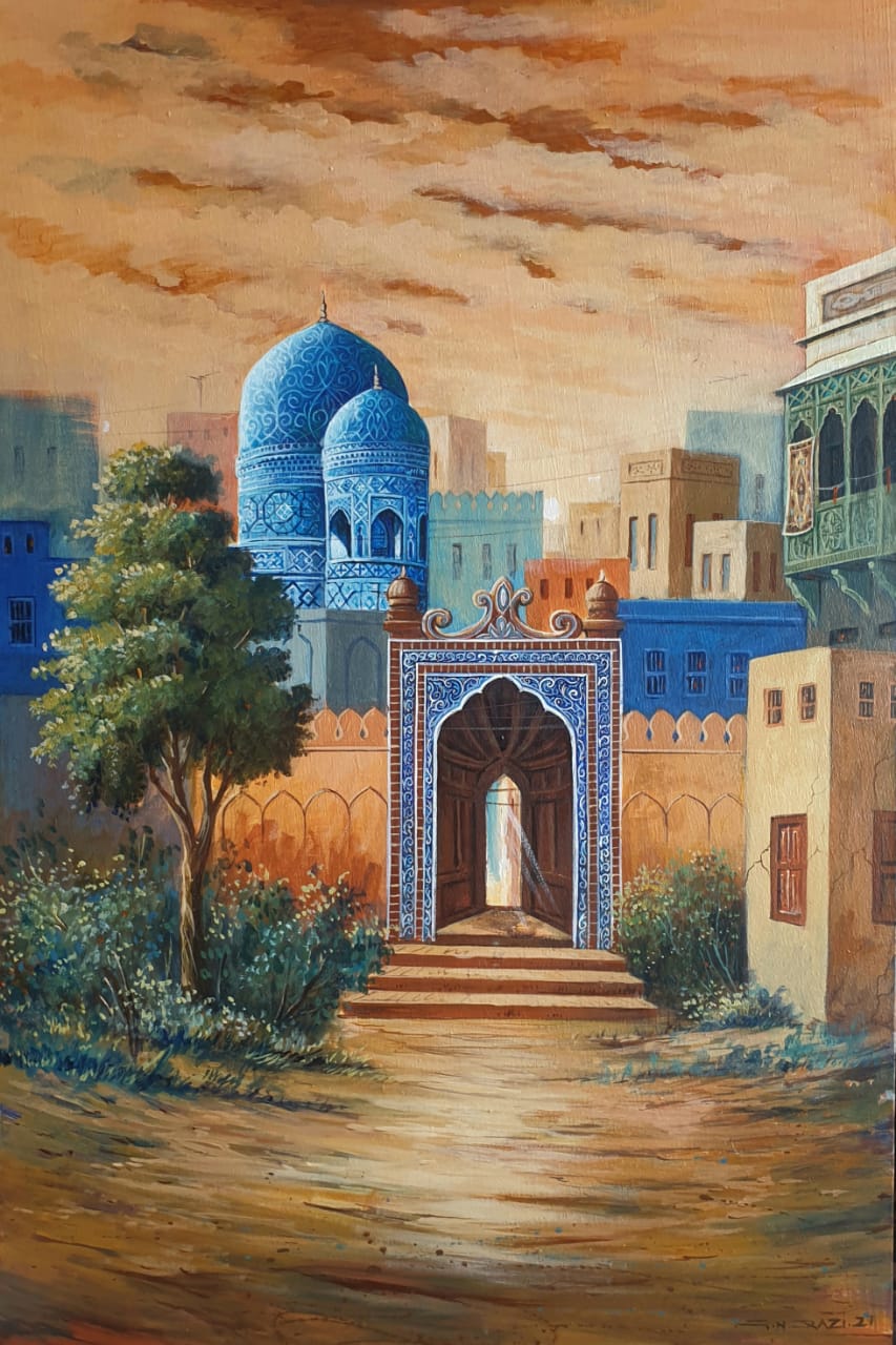 Qazi’s work is deeply rooted in the cultural and architectural heritage of Sindh, especially his hometown Thatta. His paintings capture the quiet beauty of old havelis, weathered facades, dusty streets, shrines, and bustling bazaars, creating a visual narrative that preserves the memory of a gradually fading environment. Through his art, he evokes a sense of nostalgia and tranquility, inviting viewers to reconnect with the region’s tangible heritage.
