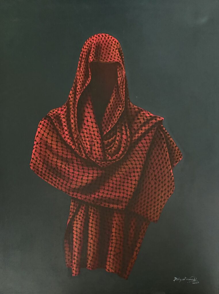Captures a hauntingly symbolic figure draped in a red keffiyeh (traditional Arab scarf). The faceless figure, cloaked in darkness, evokes themes of identity, resistance, and silent strength.The use of red and black in the keffiyeh not only draws from cultural significance but also conveys emotion—red often symbolizing struggle, resilience, or martyrdom. The absence of facial features adds a universal quality, allowing the figure to represent a broader collective experience, perhaps referencing oppressed or unheard voices.