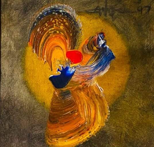 Radiating warmth, this artwork is built around a glowing golden orb. Intense strokes of orange, red, and blue converge in a dynamic, flame-like form, reflecting Gulgee’s signature style of abstract expression with hints of calligraphic inspiration.