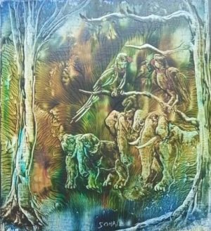 Tassaduq Sohail (1930–2017) was a Pakistani painter and short story writer known for his surrealist and often narrative-driven work. Born in Jalandhar, he moved to Karachi in 1952, where he became involved with the Urdu literary scene before moving to London in the 1960s and taking classes at St Martin’s School of Art. His paintings, many created during his forty years in London, feature a distinctive style that combines grotesque and primitive imagery with social commentary and themes of fantasy.